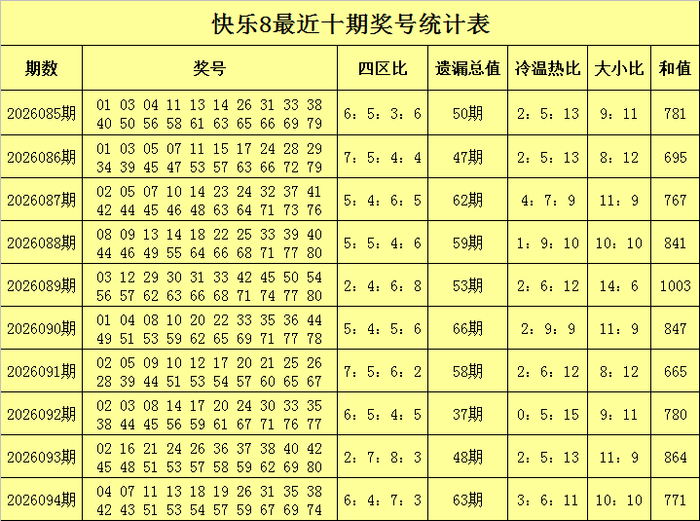 福彩快乐8第2026094期开奖回顾:04 07 11 13 18 19 26 31 35 38 42 43 51 53 54 57 59 67 69 74,其中奖号四区比为6:4:7:3,遗漏总值为63,大小比为10:10,012路比为6:7:7,和值为771。